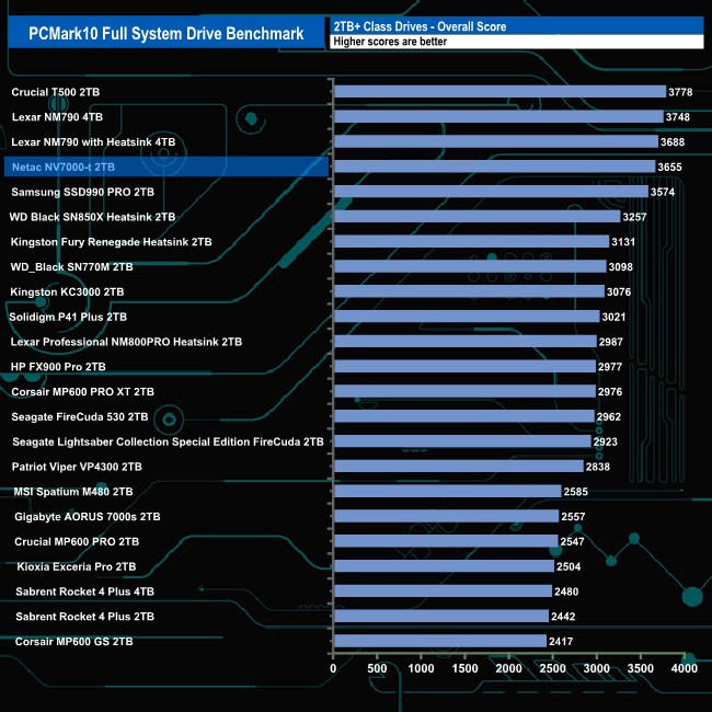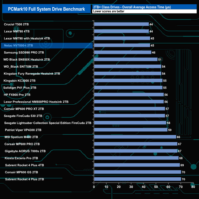 The 2TB Netac NV7000-t performed pretty well in PCMark10's Full System Drive Benchmark. It averaged 294MB/s for the six Adobe startup traces, the fastest being 368MB/s for the startup test trace of Premiere Pro. For the Adobe usage traces it averaged 568MB/s for the five tests, with the fastest being the 1,236MB/s for the Adobe Photoshop heavy usage trace.