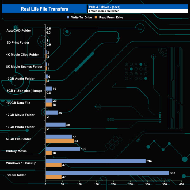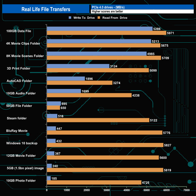The drive was much more efficient reading back the data with the average for the 13 tests being 4,879MB/s. As before the quickest transfer was the 100GB data file while the slowest was the 50GB File Folder.