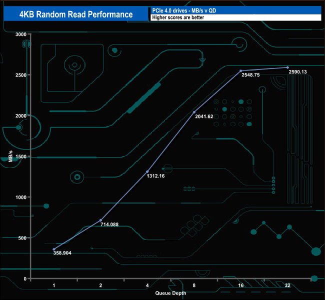 We used CrystalDiskMark 8‘s custom settings to test the 4K random read performance of the drive through a range of queue depths. The setup for the tests is listed below.