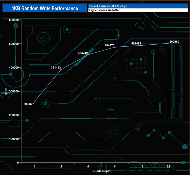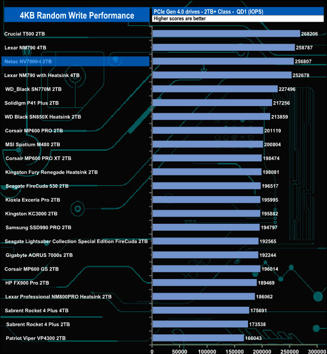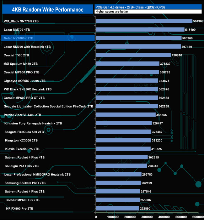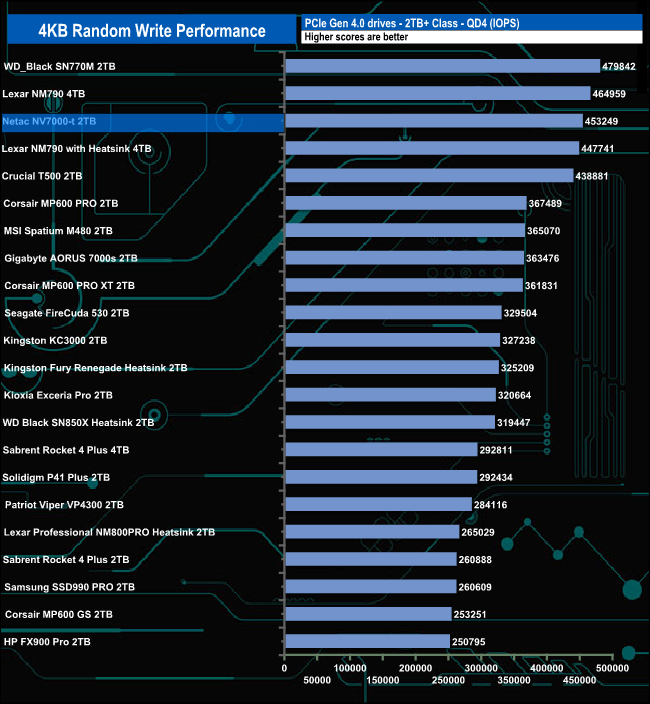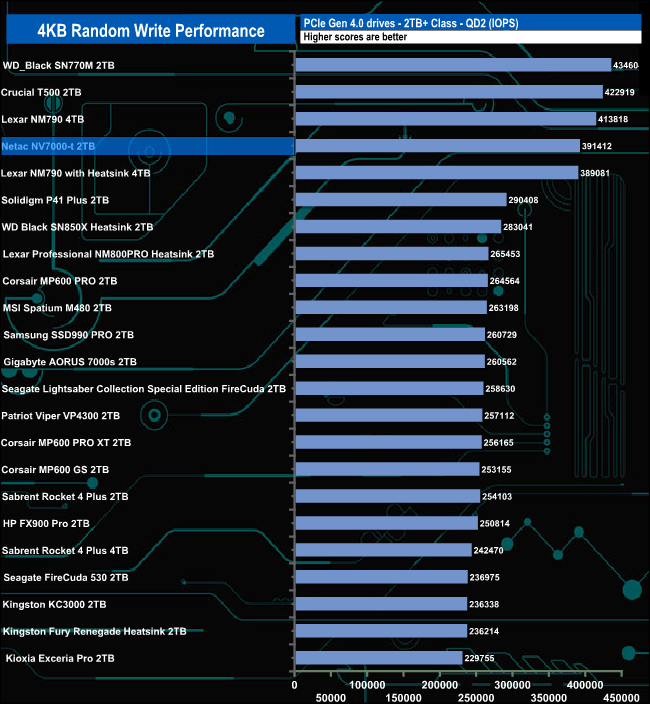Netac rates the 4K random write performance of the NV7000-t as up to 700,000 IOPS. With our four threaded tests, the best we saw from the drive was 500,000 IOPS (2,051MB/s).