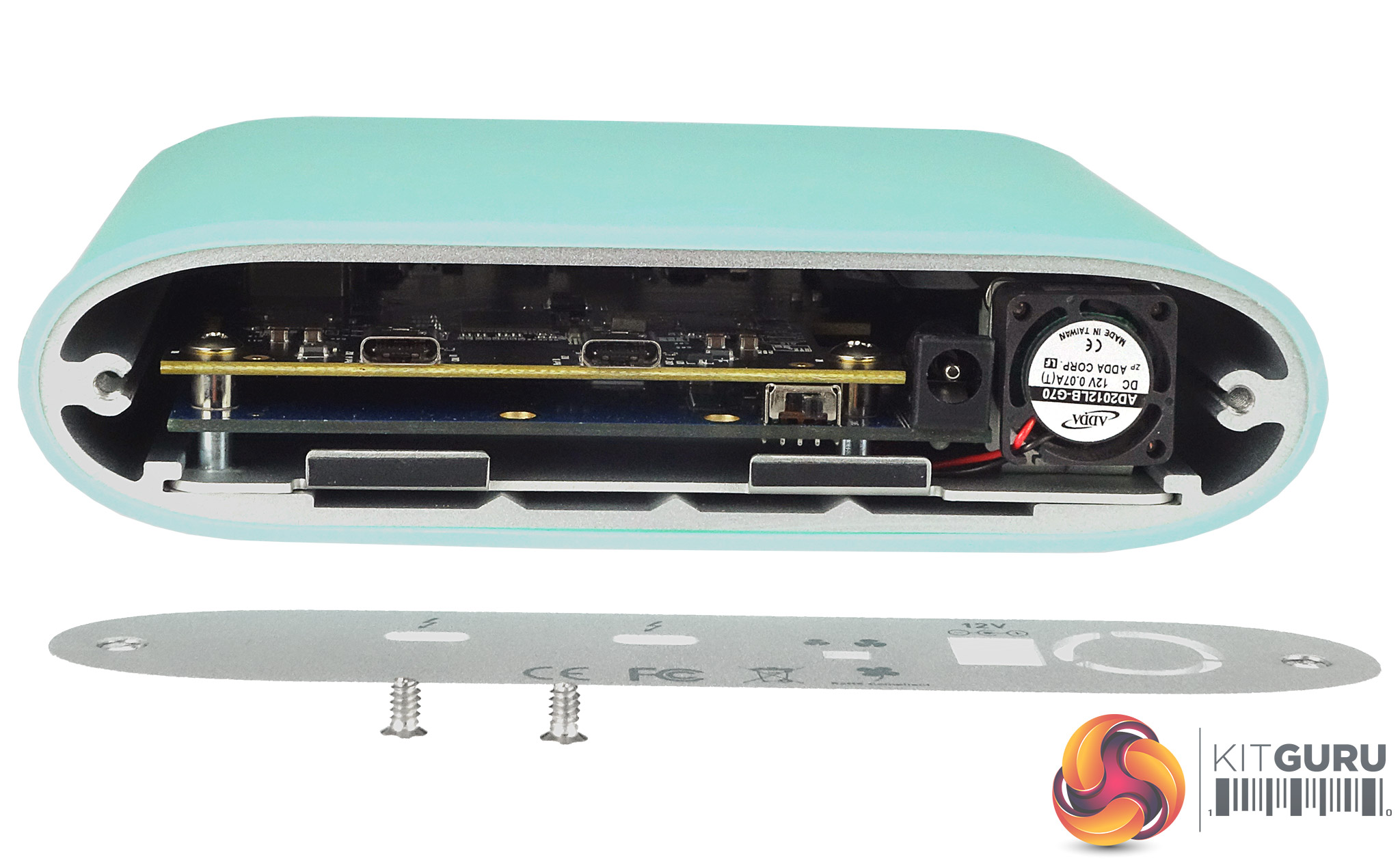 The rear panel has the two Thunderbolt ports, two-way fan switch (more on that in a minute), the power in port and the cover for the fan. The two way fan switch controls a tiny 20mm ADDA AD2012LB-G70 fan. The AD2012LB-G70 has a rated spin speed of 9,000 rpm, shifting 0.5CFM of air.
