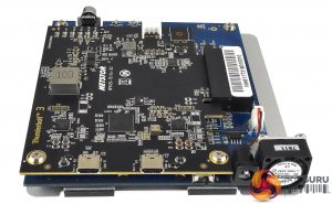 Four screws hold the PCBs to the base plate. Two short screws fix the bottom PCB which has the two M.2 connectors on the back of it. These two connectors support 2242 / 2260 / 2280 / 22110 format M.2 drives. Two longer screws go through both top and bottom PCBs into the base plate.