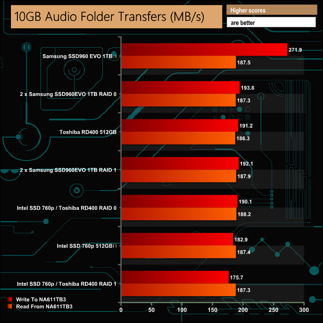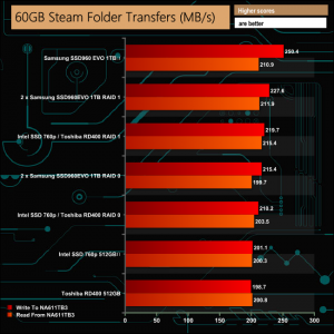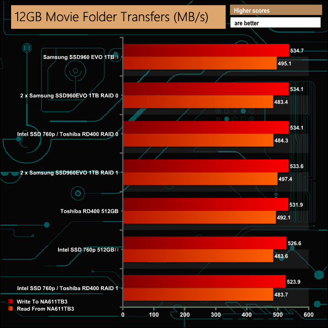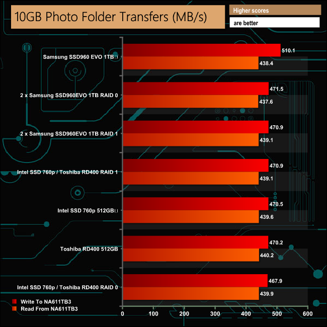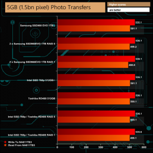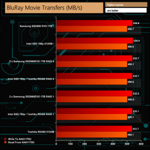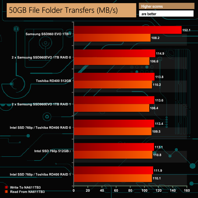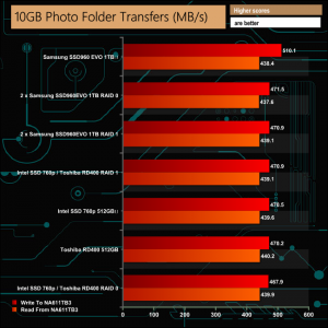 Our real life transfer tests were handled without any real problems, although the larger file sizes were dealt with much more efficiently than the smaller sized ones across all the drive options.