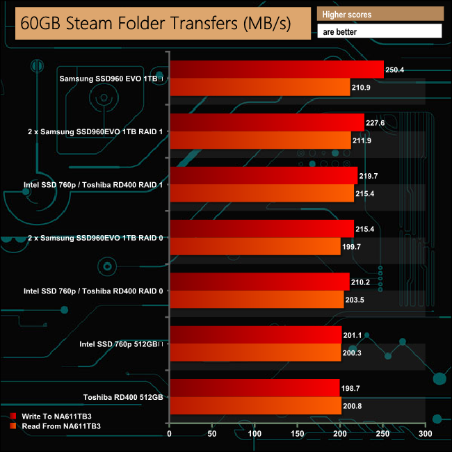 To test real life performance of a drive we use a mix of folder/file types and by using the FastCopy utility (which gives a time as well as MB/s result) we record the performance of drive reading from & writing to a 256GB Samsung SSD850 PRO.