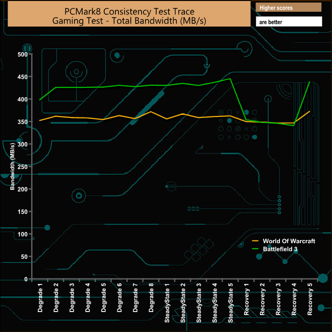 Oddly the only time the drive seems to suffer any real performance loss in the Casual Gaming tests is during the Recovery phase when testing the Battlefield 3 trace, where the bandwidth dropped to 340MB/s at one point. It only starts to pull back the performance on the very last run, recovering back up to 438MB/s.