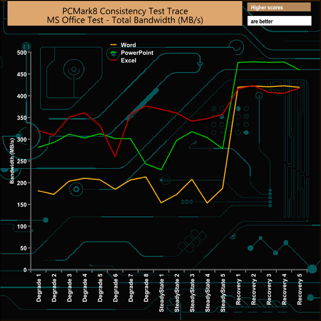 The drive's performance gets hit hard during the test runs with the Word trace. The performance drops as low as 153MB/s during the Steady State runs but the Hellfire recovers extremely well peaking at 422.29MB/s during the Recovery cycle with a very good level of consistency, averaging 420.96MB/s for the five runs.