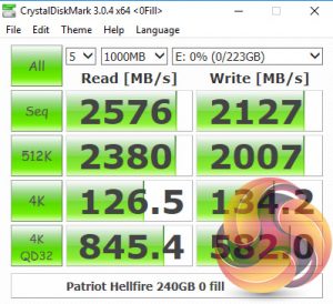 The Phison PS5007-E7 controller has a marked preference for highly compressible data as can be seen by the two benchmark result screens. Sequential read/writes and 4K/512K data reads at shallow depths get a healthy kick up in performance when the drive is tested with the highly compressible data test of CrystalDiskMark.