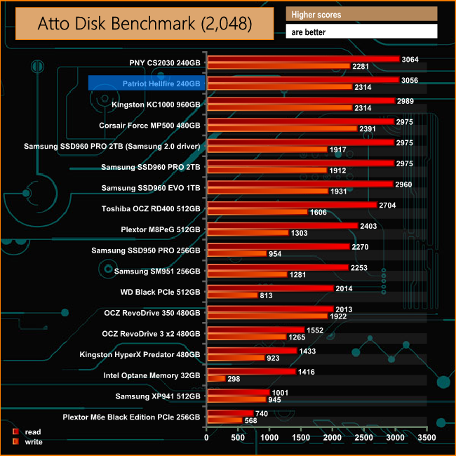 Patriot quote Sequential read/write performance for the 240GB Hellfire as up to 3,000MB/s and 2,300MB respectively. Those figures were confirmed by the ATTO benchmark, the tested drive producing 3,056MB/s for reads and 2,314MB/s for writes, making it a very quick drive.
