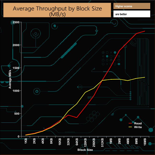 During the throughput test there was a slight dip in read performance at the 64KB block level but the drive recovered well, peaking at 2,303MB/s at the end of the test with writes peaking at 1,291MB/s.