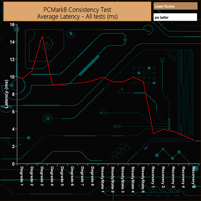 The drives performance took a hit during the second Degradation run but it recovered from that and performed pretty well through the rest of the Degradation and Steady State phases and although it certainly recovers well at the end of the test it's not very consistent through the recovery phases.