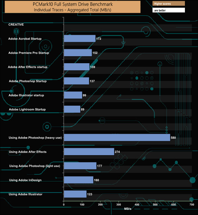 The best performance by far in the creative group of tests was the 580MB/s from the Adobe Photoshop heavy use test trace.