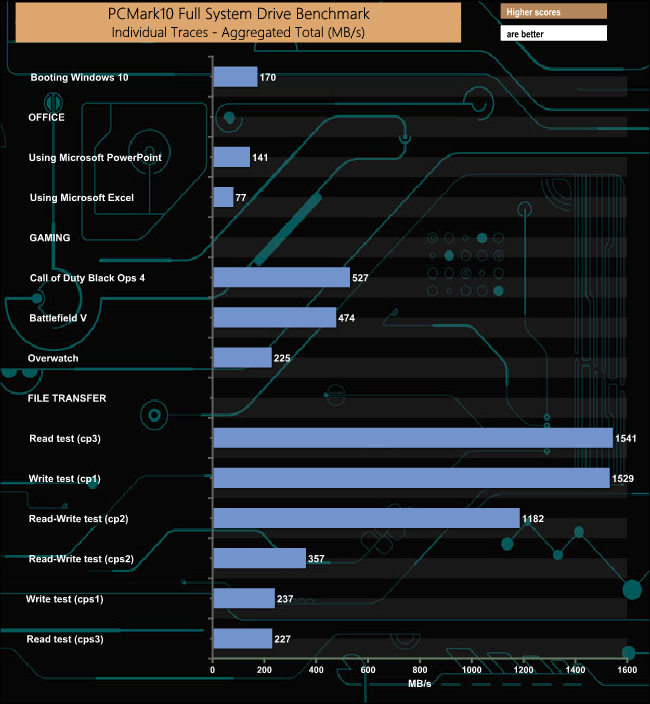 The PCMark 10 Full System Drive Benchmark uses a wide-ranging set of real-world traces from popular applications and common tasks to fully test the performance of the fastest modern drives. The benchmark is designed to measure the performance of fast system drives using the SATA bus at the low end and devices connected via PCI Express at the high end.