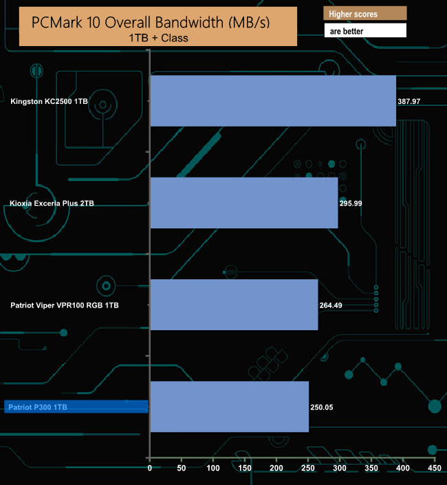 We've only just started to use the PCMark 10 Full System Drive Benchmark so overall bandwidth chart is a little short of drives but we will continue to add drives as we test them. The P300 does quite well overall considering it's an entry-level drive, its bandwidth result isn't too far behind the much more capable Viper VPR100, also from Patriot.
