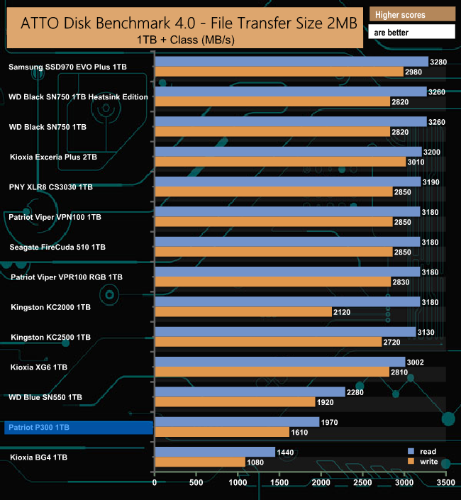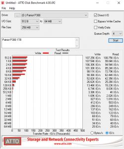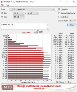 Patriot rate the 1TB P300 as up to 2,100MB/s and 1,650MB/s for Sequential read and writes respectively. Testing the review drive with the ATTO benchmark we couldn't reach those maximum figures, with reads at 1,970MB/s but tested writes were a lot closer to the official figure at 1,610MB/s.