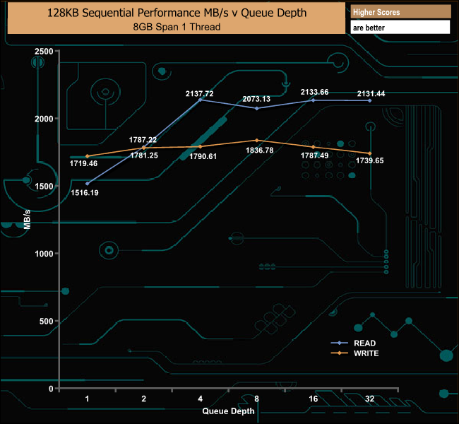 Using our own Sequential tests we could confirm the official maximum read figure of 2,100MB/s with a tested figure of 2,137.72MB/s at a queue depth of 4. The best write figure we saw was 1,836.78MB/s (QD8) which betters the official 1,650MB/s.