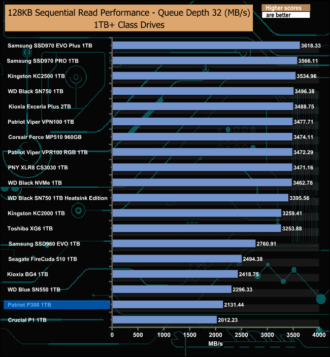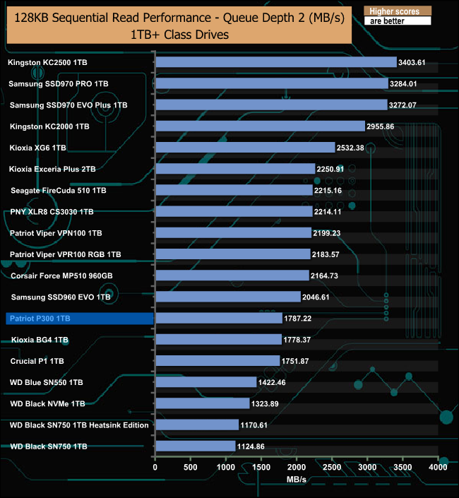 The P300's Sequential read performance falls away from its nearest competitors as the queue depth deepens.
