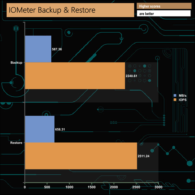 We set IOMeter up (as shown above) to test both backup and restore performance on a 100GB file.