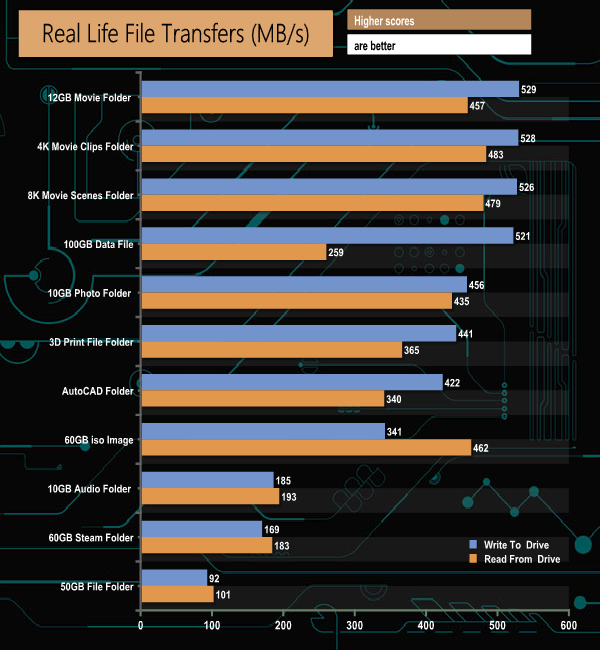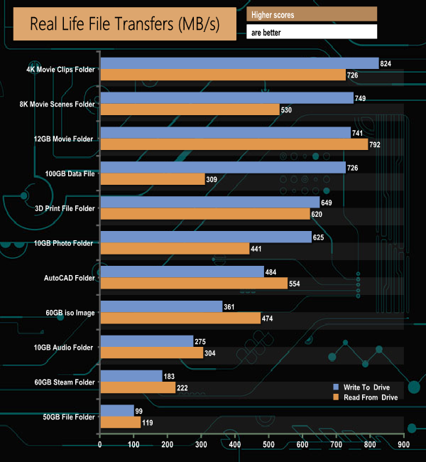 Swapping over to the NVMe drive saw the write speeds notch up when dealing with the large file sizes in the media folders. Reads are also raised but not quite as much.