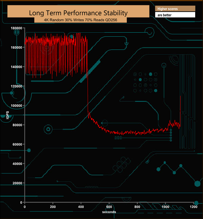 For the long term performance stability test, we set the drive up to run a 20-minute 4K random test with a 30% write, 70% read split, at a Queue Depth of 256 over the entire disk. The 1TB VP4100 averaged 109,853 IOPS for the test with a performance stability of 63%.