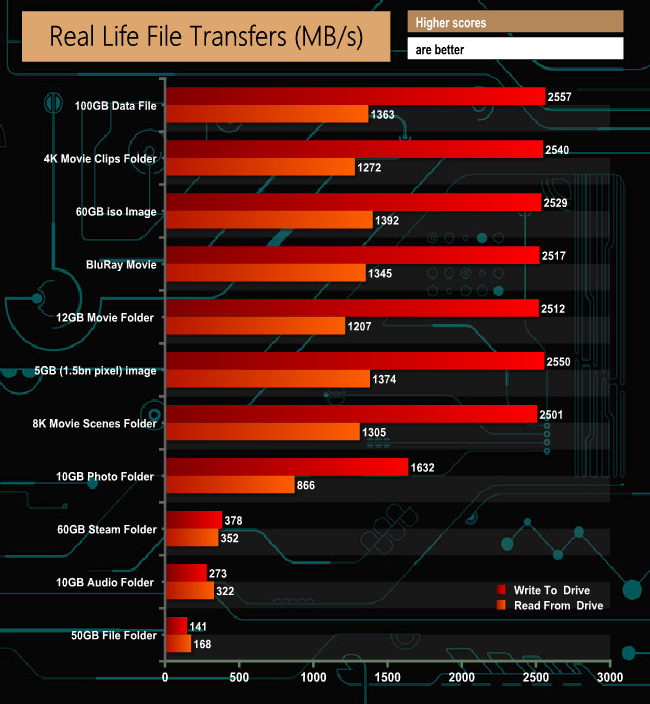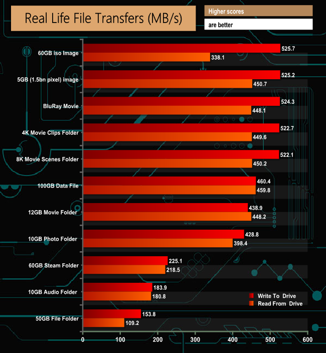 The Patriot VP4100 handles our real life file transfer tests without any problems. The drive is much more efficient at handling larger file sizes than the smaller files found in the 60GB Steam, 50GB file and 10GB audio folders.