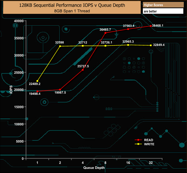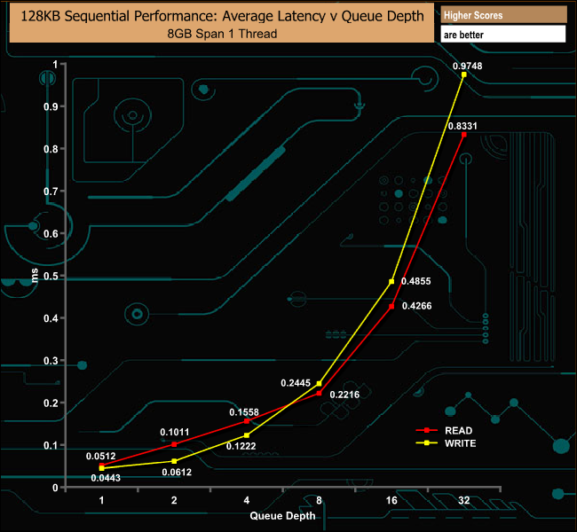 In contrast to the Sequential read performance, the Sequential write performance of the drive is the fastest we've seen for a consumer M.2 NVMe drive, across all the tested queue depths, by quite some margin.