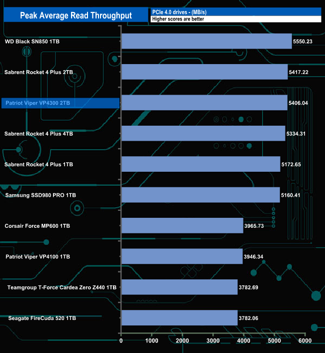 In our read throughput test the drive peaks at the end of the test at 5,406.04MB/s, a long way short of the official maximum of 7,400MB/s. It is, however, the third-fastest drive we've seen to date in our test, behind the WD Black SN850 and the 2TB version of Sabrent's Rocket 4 Plus drive.