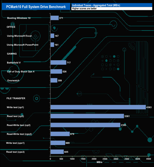 The PCMark 10 Full System Drive Benchmark uses a wide-ranging set of real-world traces from popular applications and common tasks to fully test the performance of the fastest modern drives. The benchmark is designed to measure the performance of fast system drives using the SATA bus at the low end and devices connected via PCI Express at the high end.