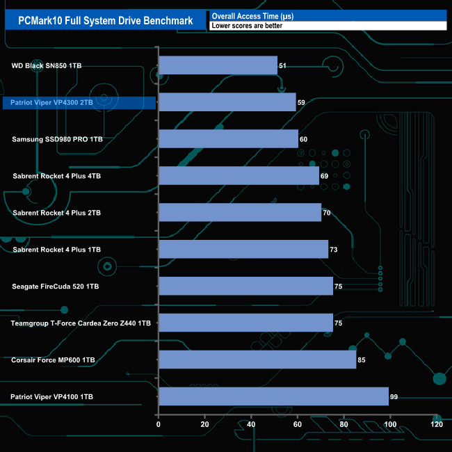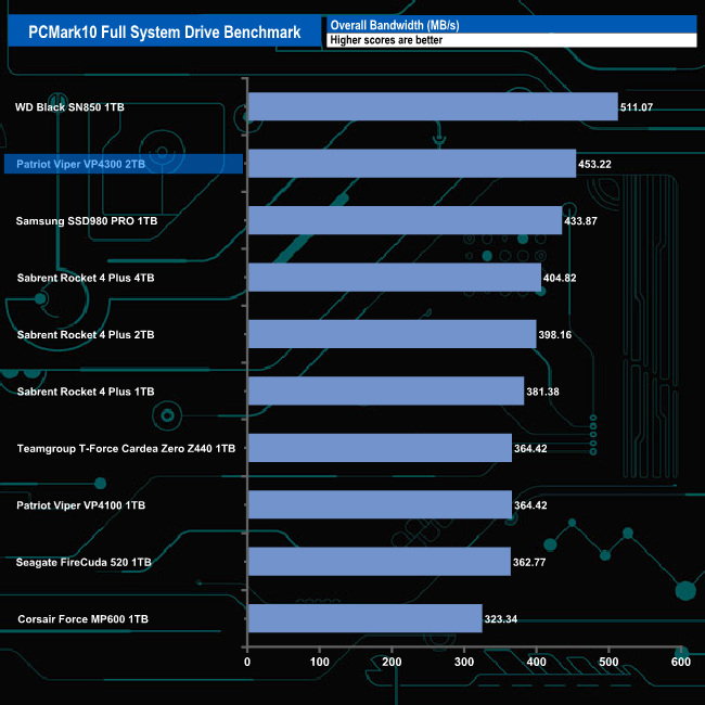 Overall the Patriot Viper VP4300 performs well in PCMark10’s Full System Drive benchmark with an overall bandwidth score of 453.22 MB/s, second only to WD's Black SN850 drive and 88.8MB/s faster than the previous generation Viper VP4100.