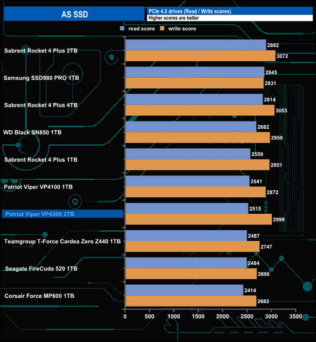 The ASSSD benchmark read score of 2515 is only good enough to put the Viper VP4300 in the bottom half of our result chart. However, its write score of 2999 is the third-fastest we've seen to date for a Gen4 drive.