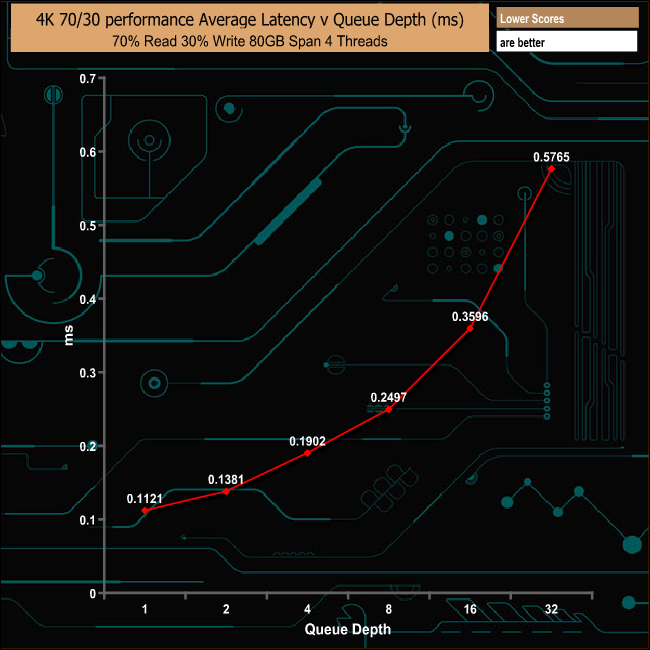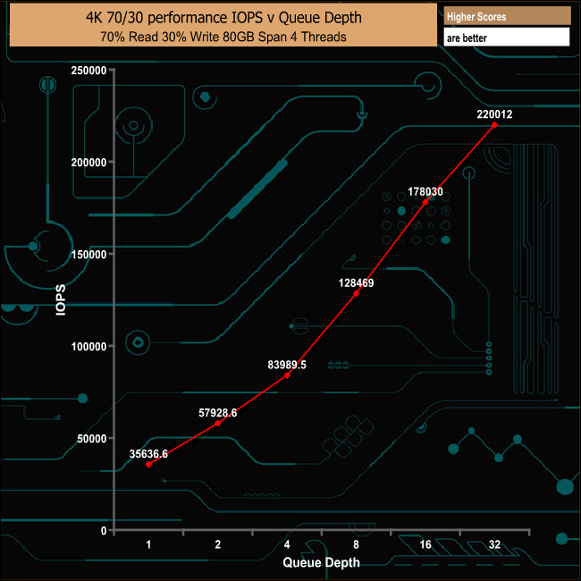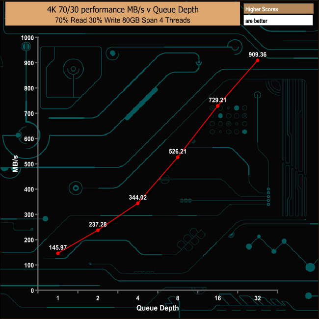 The 1TB Viper VPN100 displays strong, consistent performance in our mixed 70/30 read/write test topping out at 220,012 IOPS (909.36MB/s) at a queue depth of 32.