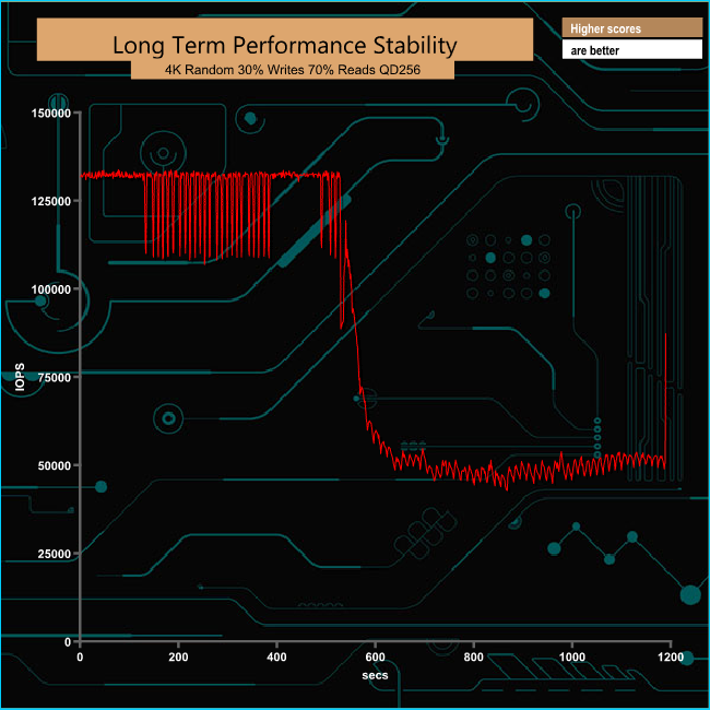 For the long term performance stability test, we set the drive up to run a 20-minute 4K random test with a 30% write, 70% read split, at a Queue Depth of 256 over the entire disk. The Viper VPN-100 1TB drive averaged 87,296 IOPS for the test with a performance stability of 65.46%.