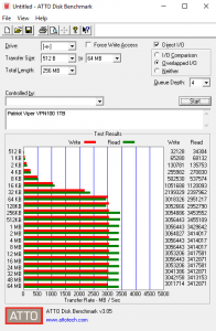 Patriot quotes Sequential performance figures for the 1TB VPN100 as up to 3,450MB/s for reads and up to 3,000MB/s for writes. Using the ATTO benchmark we could confirm both figures, with the review drive producing a read score of 3,414MB/s and 3,064MB/s for writes.
