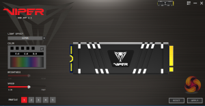 Patriot's Viper RGB APP (v2.1) software controls the VPR100's lightening effects. The control panel may look a bit basic but it does allow a host of options to be changed. There are eight standard effects including a Dark mode that switches the RGB off; the other seven are: Viper (the default option out of the box), Breathing, Heartbeat, Marquee, Raindrop, Aurora and Neon.