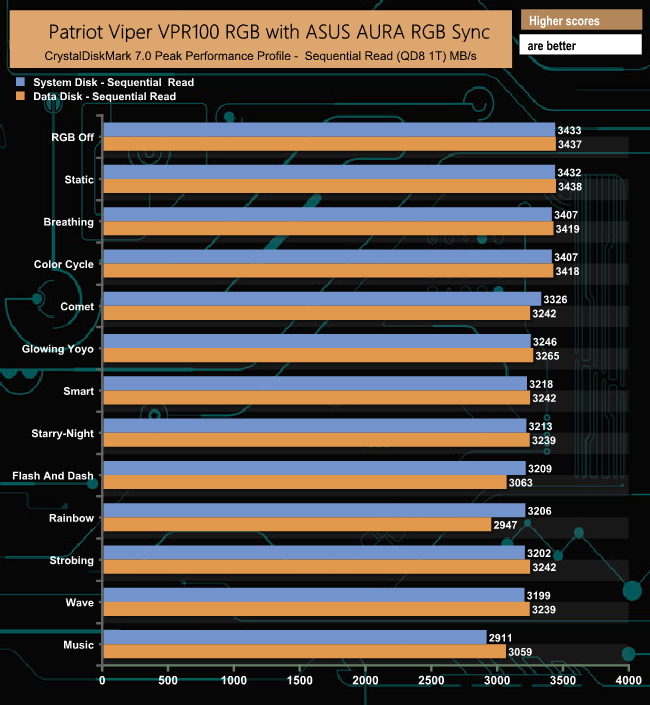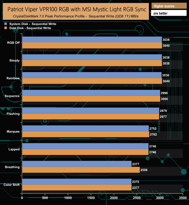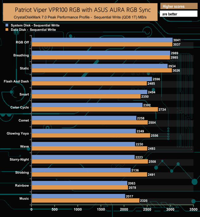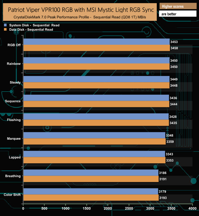 The problem appears to be that by controlling some of these RGB effects and being pushed hard, particularly when in write mode, is overwhelming the Phison PS5012-E12 controller to such an extent, that the performance is being compromised. The VPR100 seems to have more problems dealing with the RGB options in the ASUS AURA RGB than the MSI Mystic Light choices, but that's not to say that it doesn't suffer a significant drop in performance in a couple of the Mystic Light modes.