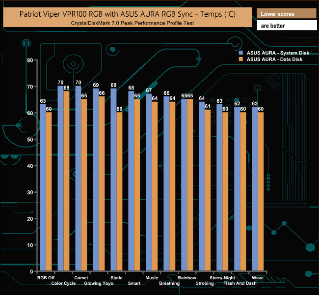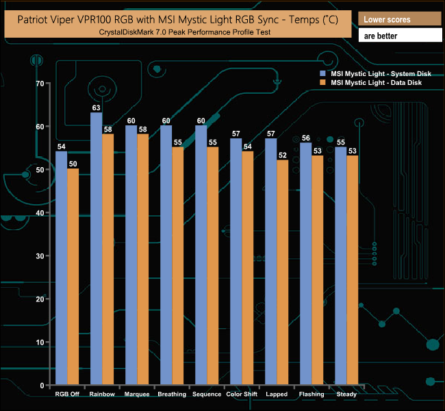 Looking at the temperature readings for the drive during these RGB test runs, the drive does get a little toasty, but not enough to start throttling back to cause the performance issues we saw. In any case, some of the largest drops are where the drive is running slightly cooler than other RGB modes.