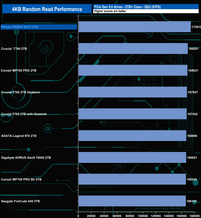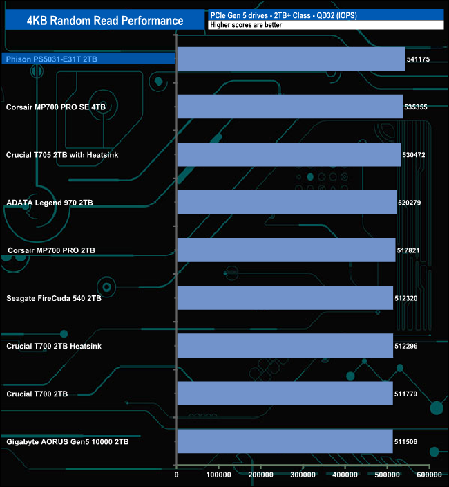 We may not have got close to the maximum official random read figure with our testing but that doesn't stop the PS5031-E31T from being the fastest Gen 5 drive we've seen to date in this test, as It tops the charts at all the tested queue depths. But the QD1 result is particularly impressive, even more so when you realise this is a controller aimed at the mainstream market and not a high-end offering like the drives it's up against in this table.