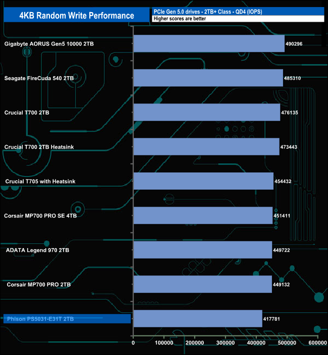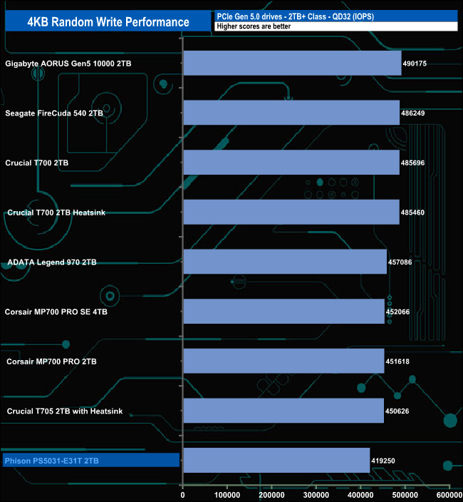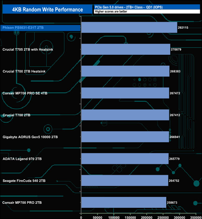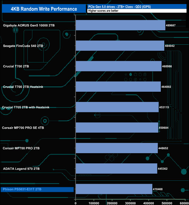 As with the random read result, the QD1 performance of the E31T is very impressive, outperforming all of the high-end drives in this list. Unfortunately, unlike the random read performance, it doesn't maintain this position as once the queue depth deepens the performance of the E31T compared to the rest of the Gen 5 drives here drops off and the drive drops to last place on the charts.