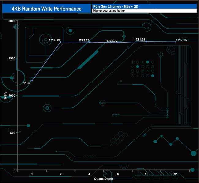 We used CrystalDiskMark 8‘s custom settings to test the 4K random write performance of the drive through a range of queue depths. The setup for the tests is listed below.