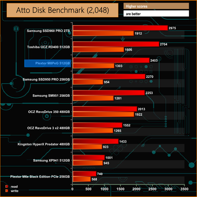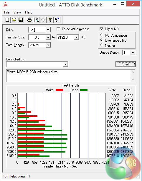 The official Sequential read/write performance figures for the 512GB drive are listed as 2,300MB/s for reads and 1,300MB/s for writes. These speeds were confirmed by the ATTO benchmark with the drive producing a little more read performance than the official figure, at 2,400MB/s.