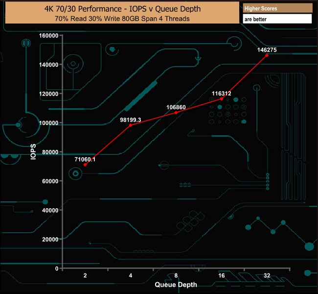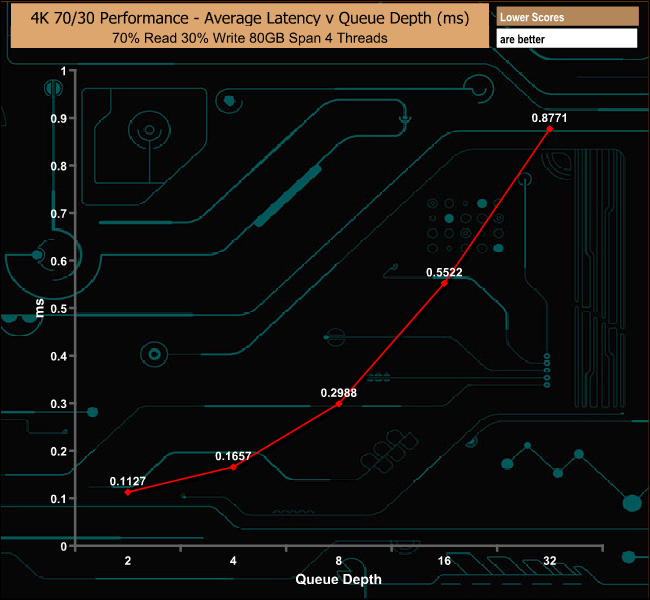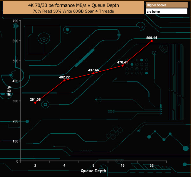 The Plextor M9Pe(Y) delivers pretty good performance in our 70/30 mixed test delivering 599.14MB/s at a queue depth of 32.