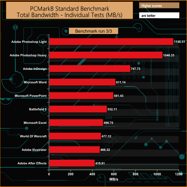 While the drive struggled with the PCM8 Consistency test, it dealt with the standard PCMark8 very well, particularly the two Photoshop tests with bandwidths of 1,146.51MB/s for Photoshop Light and 1,046.33MB/s for Photoshop Heavy. Although the After Effects test is the slowest, as it usually is, its bandwidth result for the third and final run is still above 400MB/s which is very good.