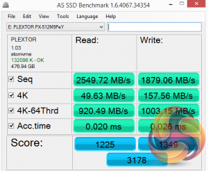 AS SSD is a great free tool designed just for benching Solid State Drives. It performs an array of sequential read and write tests, as well as random read and write tests with sequential access times over a portion of the drive. AS SSD includes a sub suite of benchmarks with various file pattern algorithms but this is difficult in trying to judge accurate performance figures.