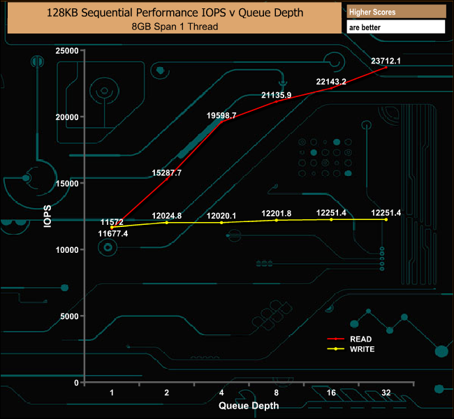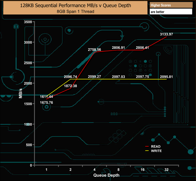 In our 128KB Sequential Read test the drive got very close to Plextor's maximum quoted transfer rate of 3,200MB/s at 3,133.97MB/s. The write performance was a little better than the official 2,000MB/s at 2,095.81MB/s.