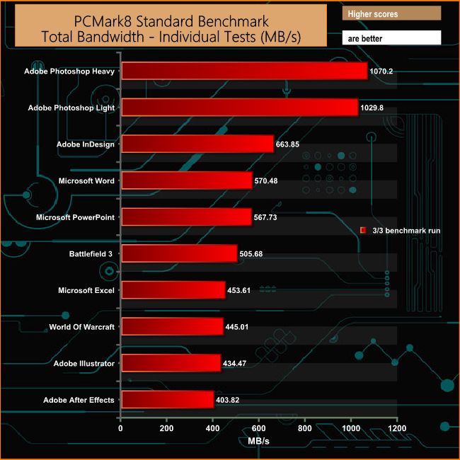 Just like the Consistency test, PCMark 8's standard Storage test also saves a large amount of performance data. The default test runs through the test suite of 10 applications three times. Here we show the total bandwidth performance for each of the individual test suites for the third and final benchmark run.