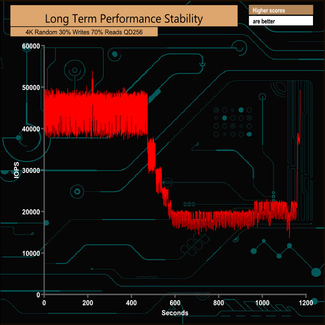For the long term performance stability test, we set the drive up to run a 20-minute 4K random test with a 30% write, 70% read split, at a Queue Depth of 256 over the entire disk. PNY's 240GB CS2030 averaged 30,629 IOPS for the test with a performance stability of 50.57%