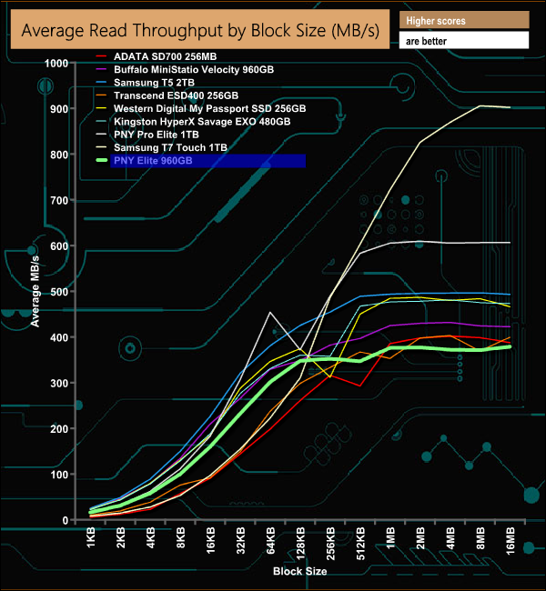 The PNY Elite's performs quite strongly at the beginning of our read throughput test, but at around the 128KB block mark the performance stalls and begins to plateau out.