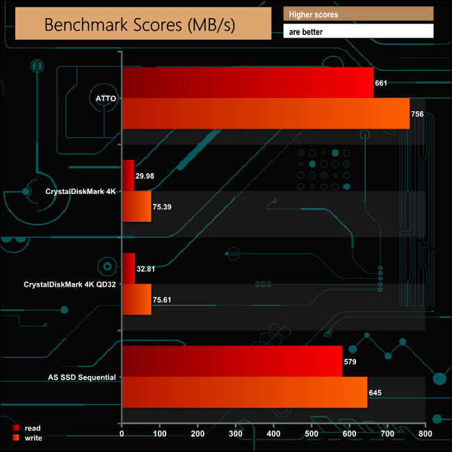 AS SSD is a great free tool designed just for benching Solid State Drives. It performs an array of sequential read and write tests, as well as random read and write tests with sequential access times over a portion of the drive. AS SSD includes a sub suite of benchmarks with various file pattern algorithms but this is difficult in trying to judge accurate performance figures.