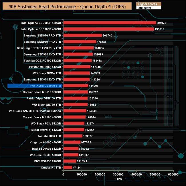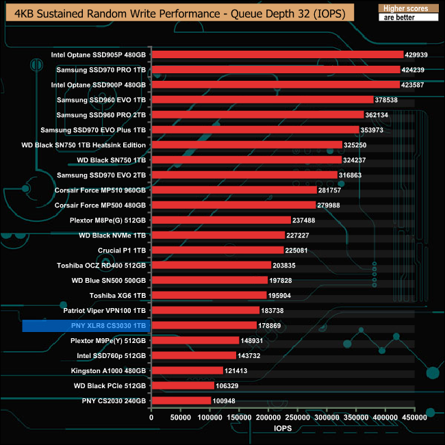 PNY don't quote any 4K random figures for the drive but the 4K random read performance gap between the CS3030 and the previous generation CS2030 widens as the queue depth deepens.
