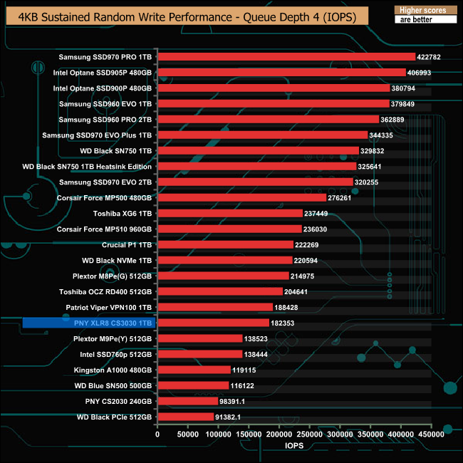 PNY don't state any 4K random performance figures for the drive but in our tests the best read IOPS figure we got from the drive was 364,725 IOPS at a QD of 32. The best write figure was 198,729 IOPS at a queue depth of 2.