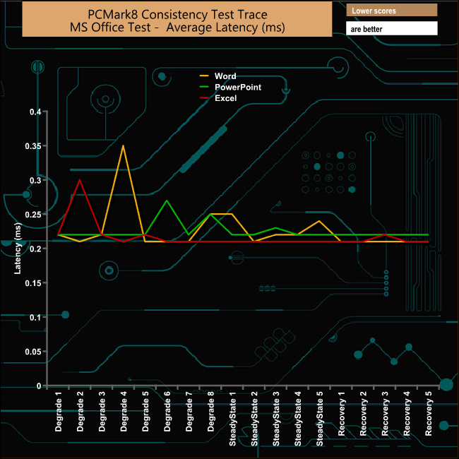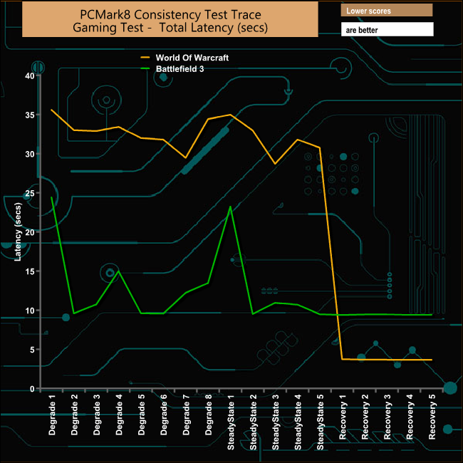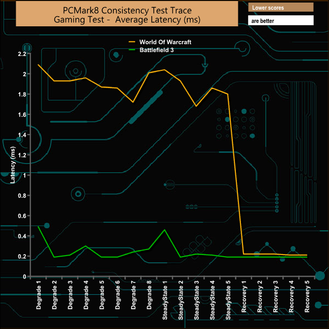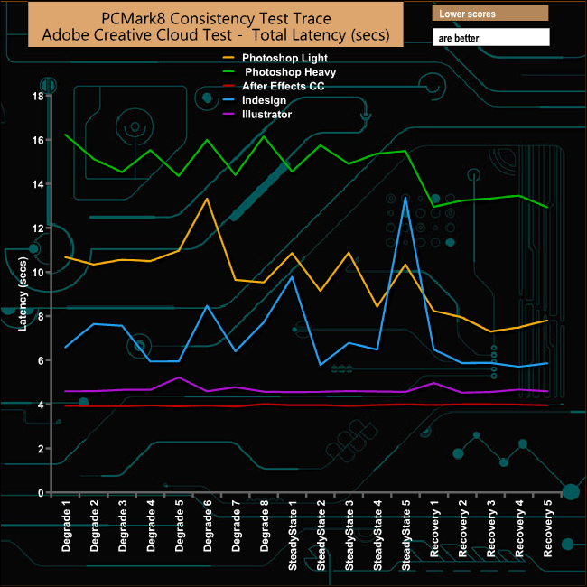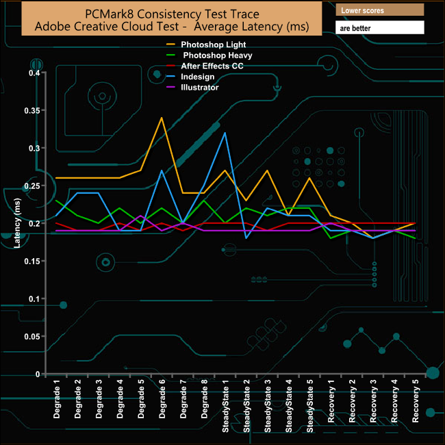 Futuremark’s PCMark 8 is a very good all round system benchmark but it’s Storage Consistency Test takes it to whole new level when testing SSD drives. It runs through four phases; Preconditioning, Degradation, Steady State, Recovery and finally Clean Up. During the Degradation, Steady State and Recovery phases it runs performance tests using the 10 software programs that form the backbone of PCMark 8; Adobe After Effects, Illustrator, InDesign, Photoshop Heavy and Photoshop Light, Microsoft Excel, PowerPoint, Word, Battlefield 3 and World of Warcraft. With some 18 phases of testing, this test can take many hours to run.
